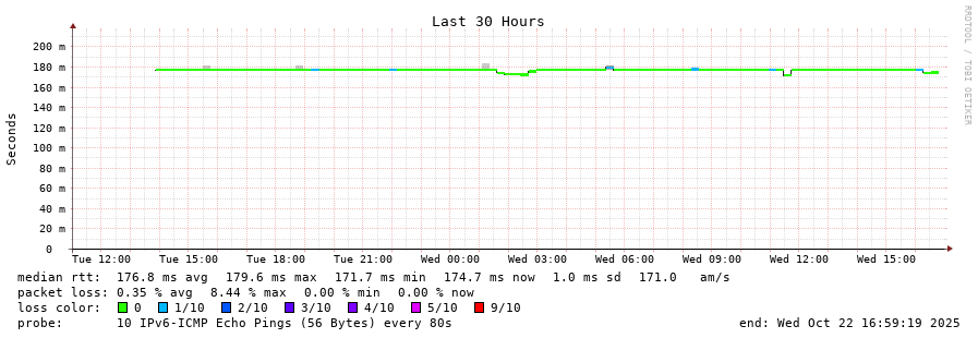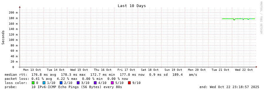 13 > 2a02:a58:400c:5::2 (2a02:a58:400c:5::2) [AS8953] 176.634ms 176.692ms 176.662ms