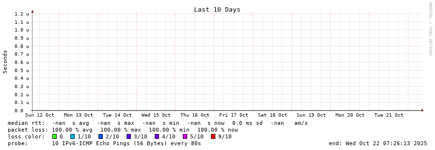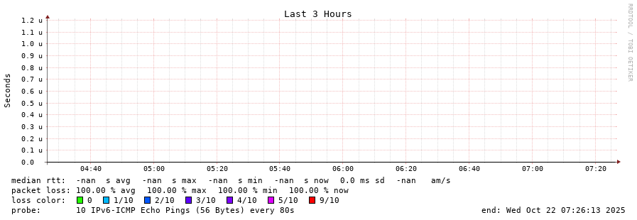 traceroute to fd9b:f75:a3d5::2 (fd9b:f75:a3d5::2), 30 hops max, 80 byte packets - Generated at 2025-10-21 20:30:01 3 > 2001:550:2:18::32 (2001:550:2:18::32) [AS174] 1.228ms !N