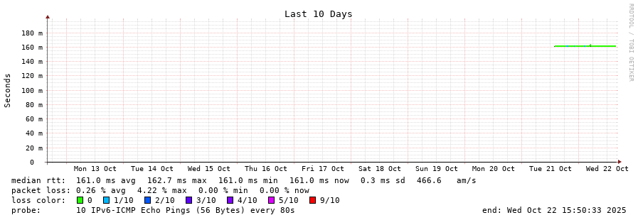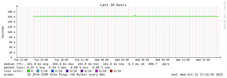 traceroute to 2a00:c30:bbbb:d::2 (2a00:c30:bbbb:d::2), 30 hops max, 80 byte packets - Generated at 2025-10-21 20:30:01